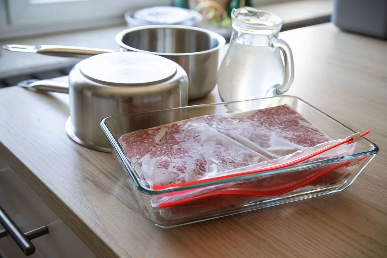 Und so geht's: Das Fleisch im Gefrierbeutel auf einen umgedrehten Topf legen. Einen zweiten Topf daraufstellen und mit warmem Wasser füllen - kein heißes Wasser verwenden.