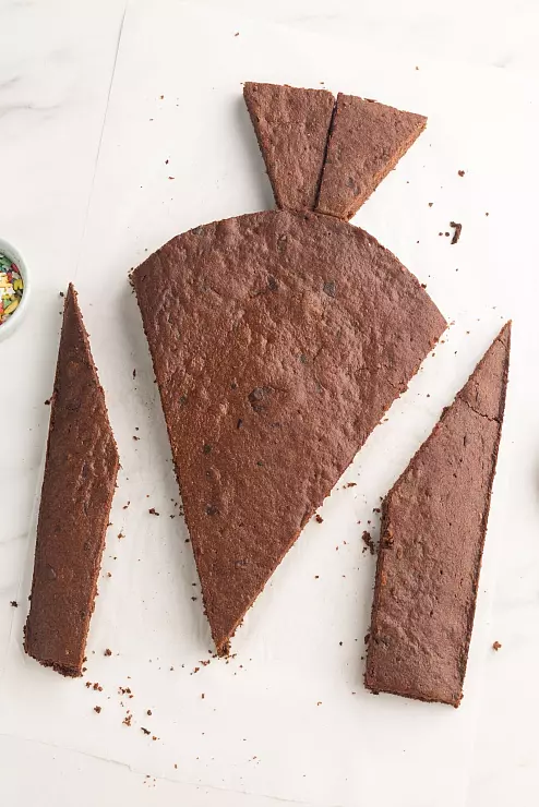 Die breiteste Stelle der Schultüte sollte ihr zufolge so breit sein wie die Kuchenplatte selbst, damit möglichst wenig Teig-Abschnitte übrigbleiben. An der unteren Seite, wo die Schultüte spitz zuläuft, können Sie zwei kleinere Dreiecke abschneiden, die später den oberen Abschluss der Schultüte darstellen.