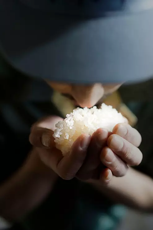 Dann kommt der Koji-Pilz ins Spiel. Er wurde über 2.000 Jahre verfeinert und wird über den Reis gestreut. Nach 48 Stunden ist der Reis mit einem Enzym überzogen wie ein Camembert. Das liegt daran, dass dieser eigens gezüchtete Schimmelkulturen-Zauber die Stärke im Reis vergärbar macht. Zudem sorgt er für die Aromen.