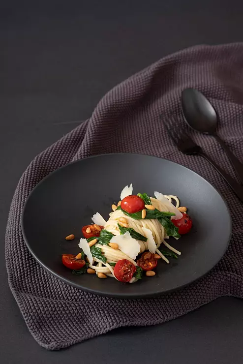 Für Produkte wie Salat benutzt Prus Pinsel und Öl oder eine Sprühflasche mit Wasser. «Durch die Lichtreflexe, die dadurch entstehen, sehen die Zutaten frischer aus und es ermöglicht ein spannendes Spiel zwischen glänzend und matt.» Wie Ostler und Noack nutzt auch Prus eher asymmetrische Gestaltungsformen und verteilt Tomaten etwa ungleichmäßig auf einem Salat: mal eine einzelne, eine versteckt, zwei übereinander.
