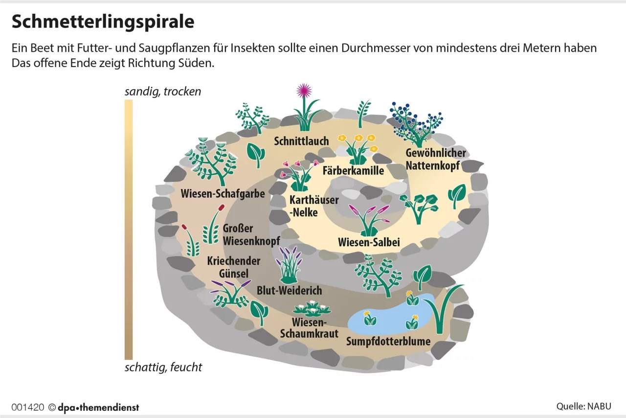 Genauer gesagt: Ein spiralförmiges Beet mit verschiedenen Futter- und Saugpflanzen. Das Beet bietet Insekten ideale Lebensbedingungen, so der Naturschutzbund Deutschland (Nabu).