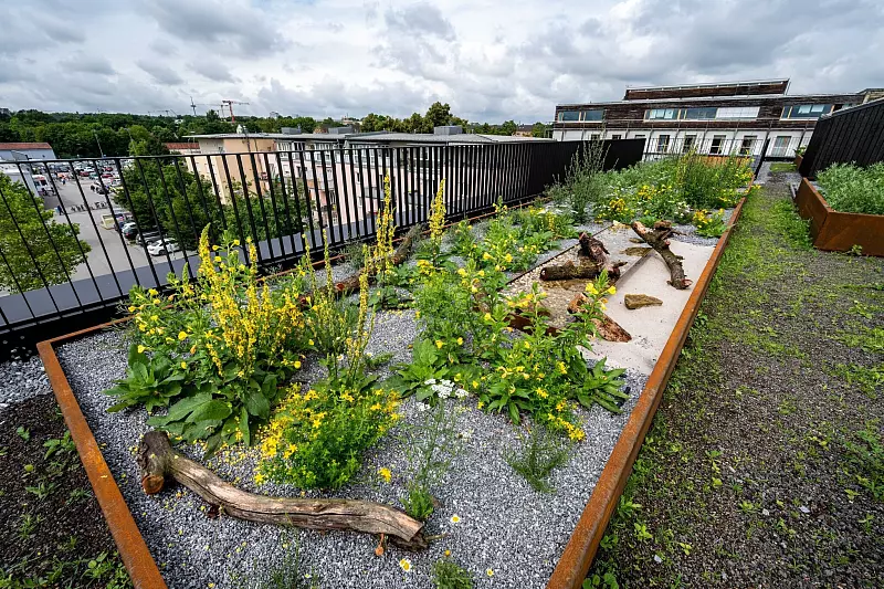 Das Dach wird also nur ab und zu betreten. «Geeignet für solche Dächer sind Pflanzen, wie sie auch in Steingärten gedeihen, zum Beispiel Moose, Gräser, Sedum, Mauerpfeffer und Kräuter. Auch seltene Arten, die auf der Roten Liste stehen und sehr attraktiv für Bienen und andere Insekten sind», so Michael Henze.