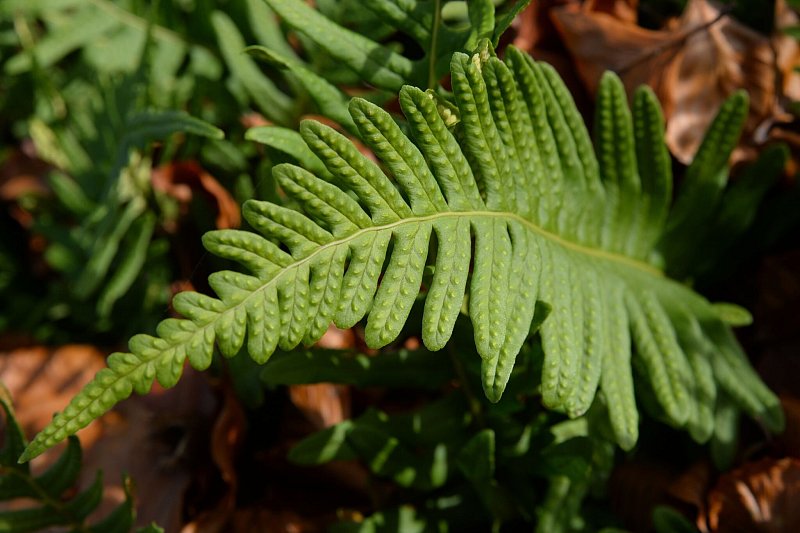 - Tüpfelfarn hat zarte, federförmige Blätter mit lederartiger Textur und ist ebenfalls immergrün. Er bleibt mit etwa 70 Zentimetern relativ niedrig und verträgt auch trockeneren Boden und etwas mehr Sonne.