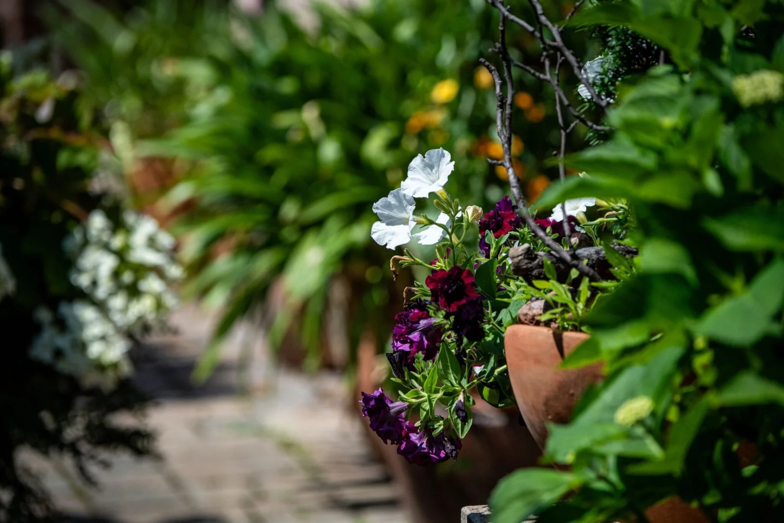 Man sollte keinen einzelnen Topf an eine Fassade oder in eine Ecke stellen, sondern lieber mehrere Gewächse nebeneinander gruppieren. Dadurch sieht der Garten sofort sehr grün aus. Dazu die Pflanze einfach mit verschiedenen Begleitpflanzen kombinieren.