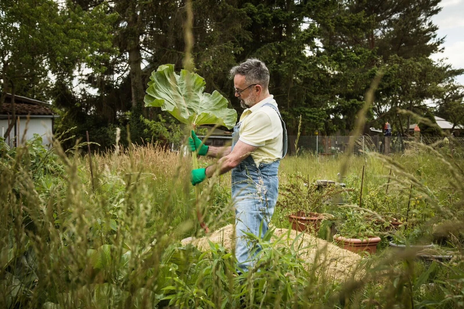 Die riesigen Blätter des Rhabarbers können große Flächen des Bodens bedecken. Sie liefern Kalium, wodurch Gemüse Wasser besser aufnehmen kann. Man sollte jedoch regelmäßig einen Blick unter die Blätter werfen und die Schnecken absammeln.
