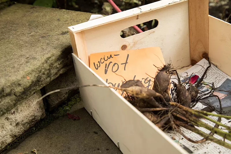 Also heißt es: raus mit den Knollen und frostfrei einlagern. Man wartet bis zum ersten Nachtfrost, dann sterben die oberirdischen Triebe ab. Ideal ist, wenn man sie dann noch etwa eine gute Woche in der Erde lässt. Wer sich Blütenfarbe und Pflanzenhöhe für die Pflanzung merken will, sollte frühzeitig während der Blüte an die Stielbasis eine Notiz mit einem Draht befestigen. Bei trockenem Wetter werden die Knollen ausgegraben und die Erde abgeschüttelt. Dann geht es ins Winterquartier.