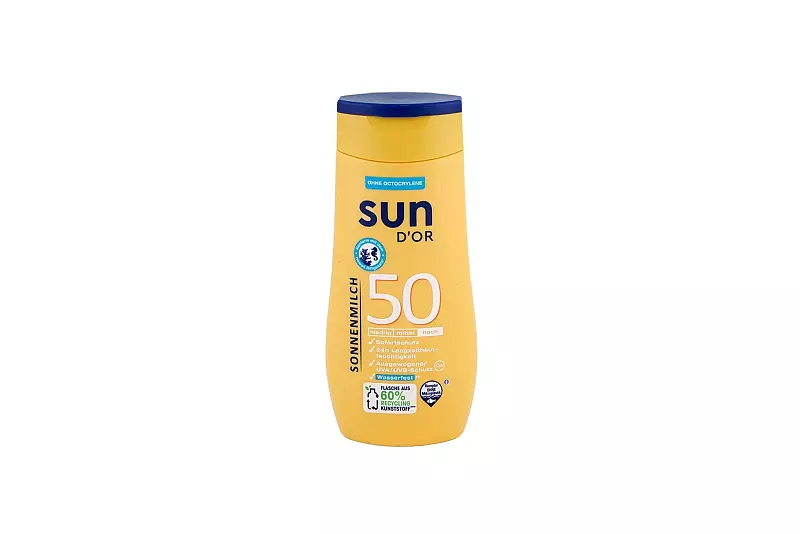 - «Sun D'Or Sonnenmilch, 50» von Budni bzw. Edeka (3,57 Euro pro 200 Milliliter)