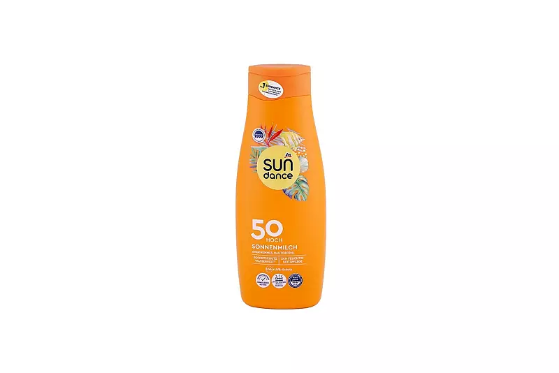 - «Sundance Sonnenmilch, 50» von Dm (3,18 Euro pro 200 Milliliter).