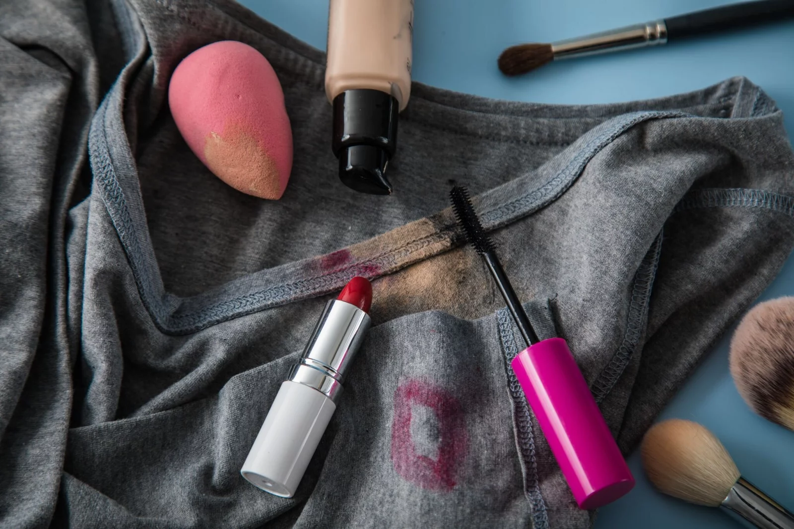 Zuerst sollte überschüssige Schminke mit einem sauberen, trockenen Tuch oder Küchenpapier vorsichtig abgetupft werden. Wichtig: nicht reiben, sonst arbeitet man die Farbpigmente tiefer in die Fasern ein.