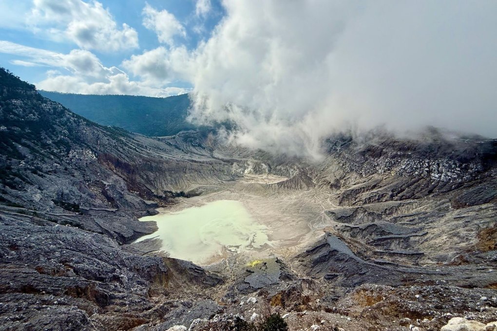 Dann aber ändert sich die Landschaft schlagartig: Am Gipfel des Tangkuban Perahu in etwa 2.000 Metern Höhe angekommen, öffnen sich atemberaubende Ausblicke in den Kessel des Ratu-Kraters - samt eines leuchtend hellblauen Sees. Aus den Ritzen des vegetationslosen Vulkangesteins steigen heiße Dämpfe auf. Schwefelgeruch kitzelt die Nase. Asche und erkaltete Lava verleihen den Hängen einen mondähnlichen Anschein. Diese unwirtliche Kargheit macht die Szenerie umso dramatischer.