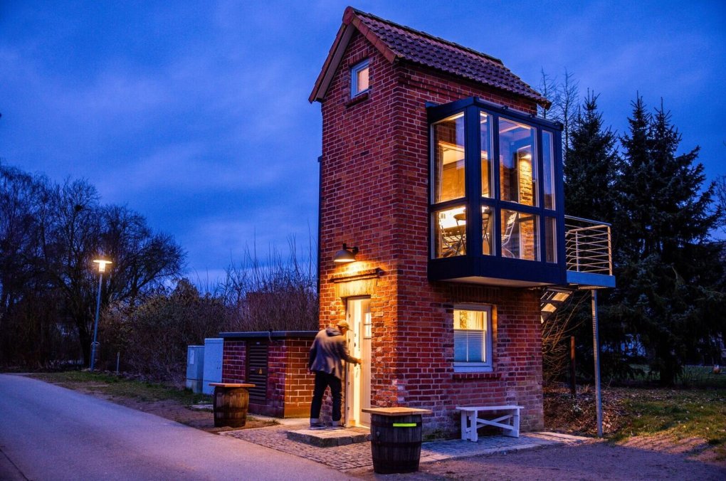 Elf Quadratmeter, verteilt auf zwei Etagen: Für Reisende, die auf großem Fuß leben, ist diese Ferienwohnung im kleinen Ort Rieps zwischen Schwerin und Lübeck nichts. Doch wer es heimelig und klein mag, für den ist der schmale Trafoturm aus Backstein mit seinen großen Glasfronten vermutlich genau das Richtige.