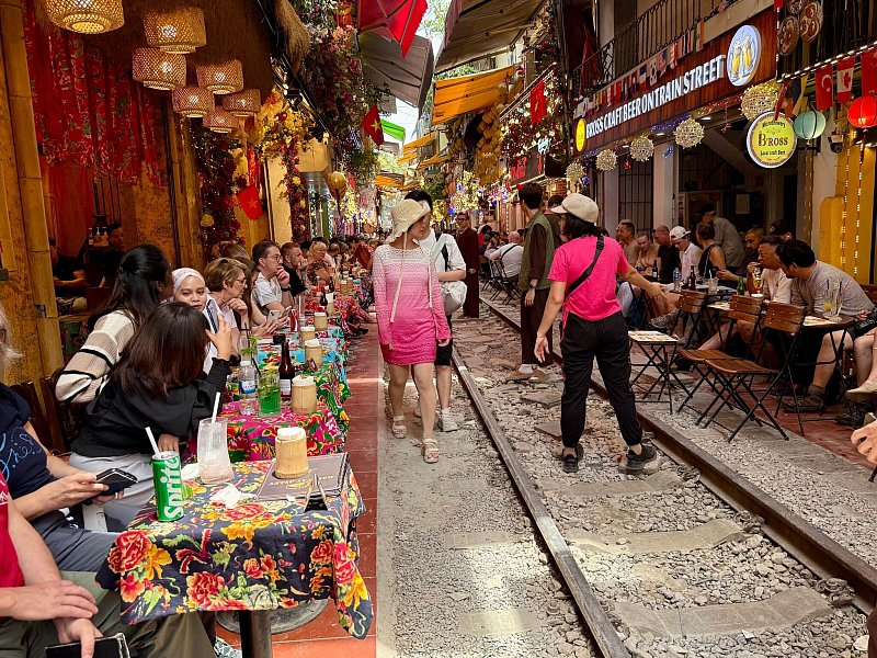 Auf Klappstühlen plaudern Hunderte Touristen aus aller Herren Länder mitten in der Altstadt von Vietnams Hauptstadt Hanoi. Sie schlürfen traditionellen Eierkaffee oder frisches Kokoswasser. Das Besondere an dieser Straßenszene: Genau in der Mitte zwischen den engen Häuserblocks mit ihren zahlreichen bunten Cafés verläuft eine Zugtrasse.