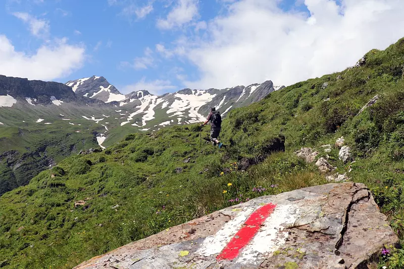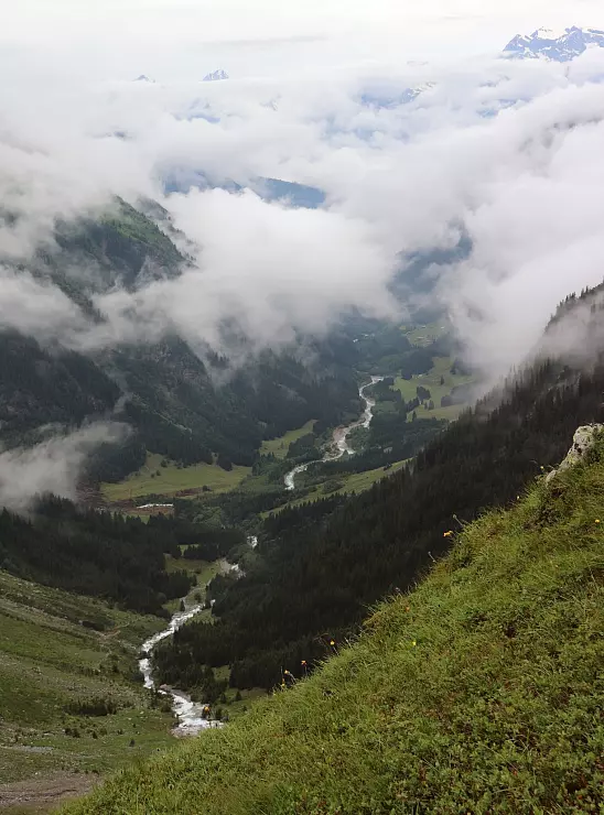 Dann hinter dem Diesrut-Pass (2.428 m) weitet sich der Blick auf eine Schwemmebene: Unzählige Wasserläufe mäandern umher. Sie nähren den Rein da Sumvitg, einen Zufluss des Rheins, der sich tief unterhalb der Wanderer in grauen Schleifen auf grüner Aue ausbreitet.