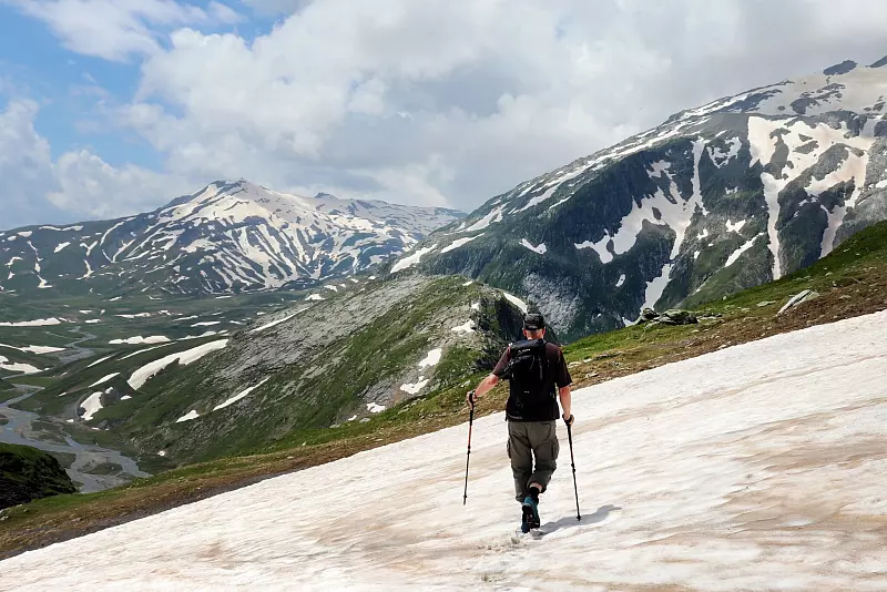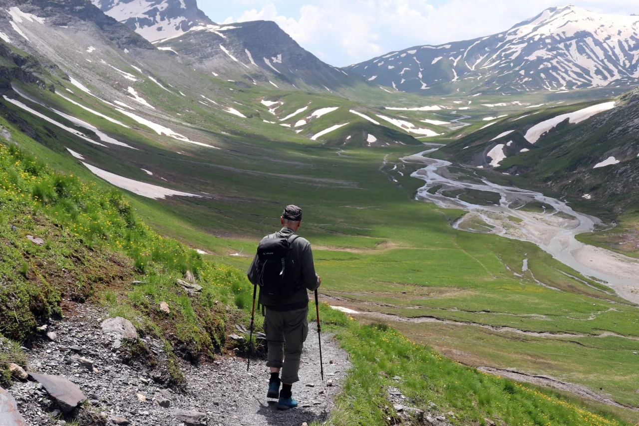 Schon beim Aufstieg aus dem Val Lumnezia, zu Deutsch «Tal des Lichts», bekommt man eine Ahnung: Diese Tour wird anders als andere Wanderungen in den Alpen. Die Gruppe überquert sumpfige Wiesen, letzte Schneefelder und vorsichtig, auf überspülten Steinen balancierend, einen tosenden Bergbach.