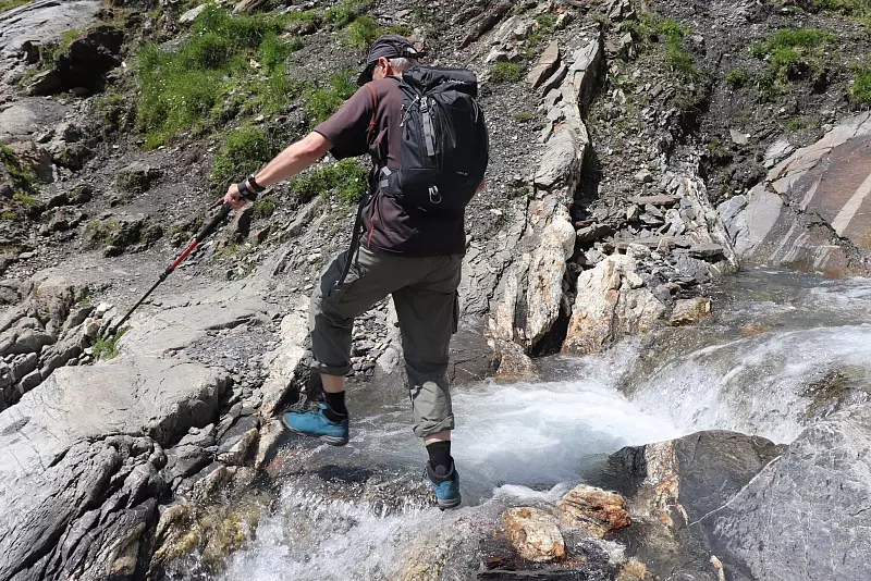 Marianne erklärt unsere Variante: «Einmal gehen wir der Greina entgegen, auf dem Rückweg folgen wir dem Wasserlauf.» Auch exponierte Stellen meistert die Sportlerin ohne Stöcke und Kettennutzung, achtet aber stets darauf, dass kein Weggefährte auf der Strecke bleibt.