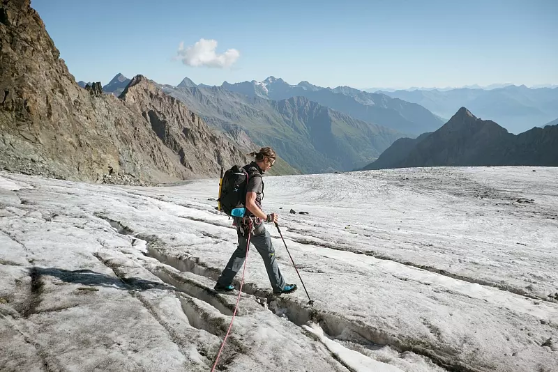 «Da setzt man halt Schritt vor Schritt und hält mal zum Luft holen an», sagt Michael. Manchmal ist der Pfad ein wenig ausgesetzt - heißt: auf einer oder beiden Seiten fällt das Gelände steil ab - oder führt ein kurzes Stück auch über den Gletscher. Einige Stellen erfordern eine leichte Kletterei, doch sie sind gut gesichert.