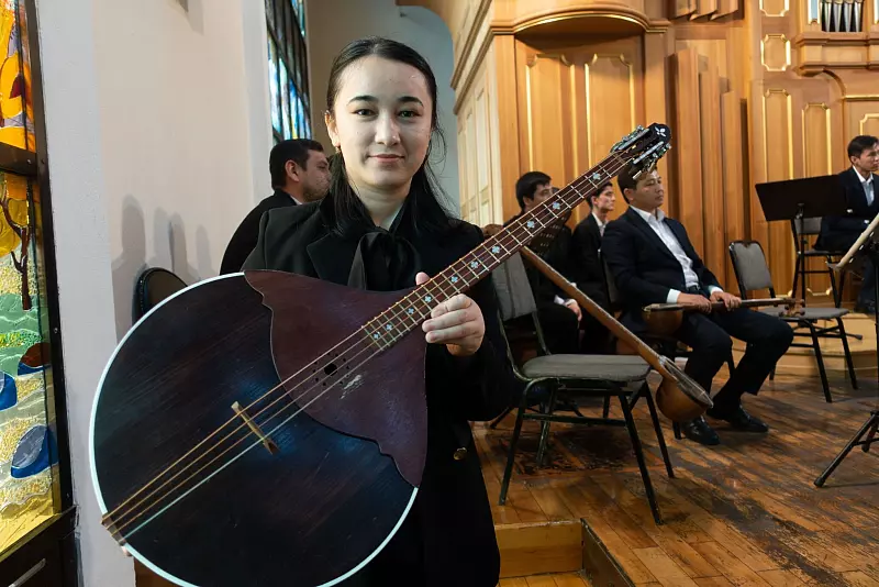 Bei einem Konzert im Konservatorium tritt die 22-jährige Muslimin Feruza Mamirjonova mit dem traditionellen Saiteninstrument Dutor und ohne Schleier auf - «Usbekistan ist in jederlei Hinsicht ein Land in der Entwicklung», sagt die Musikerin, die wahre Beifallsstürme entfacht.