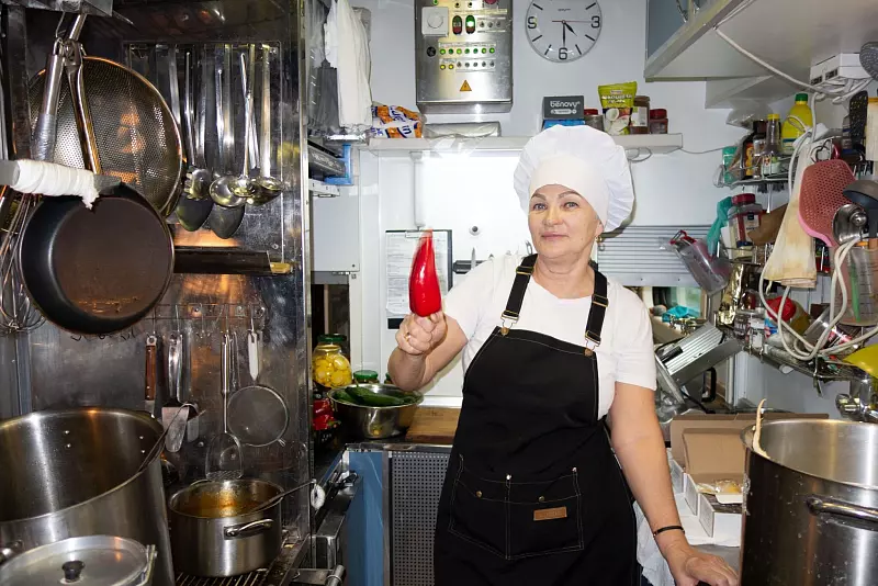 Auf den 1.067 Kilometern nach Kirgistan steht Chefköchin Larisa Koshevnikova mit ihrem Team extrem unter Dampf. Suppen, Omelettes, Schweinerippchen. Keine Haute Cuisine, aber lecker. Das Schaukeln macht der 59-Jährigen in der Bordküche nichts aus. Koshevnikova hat schon auf einem Ozeandampfer gearbeitet.
