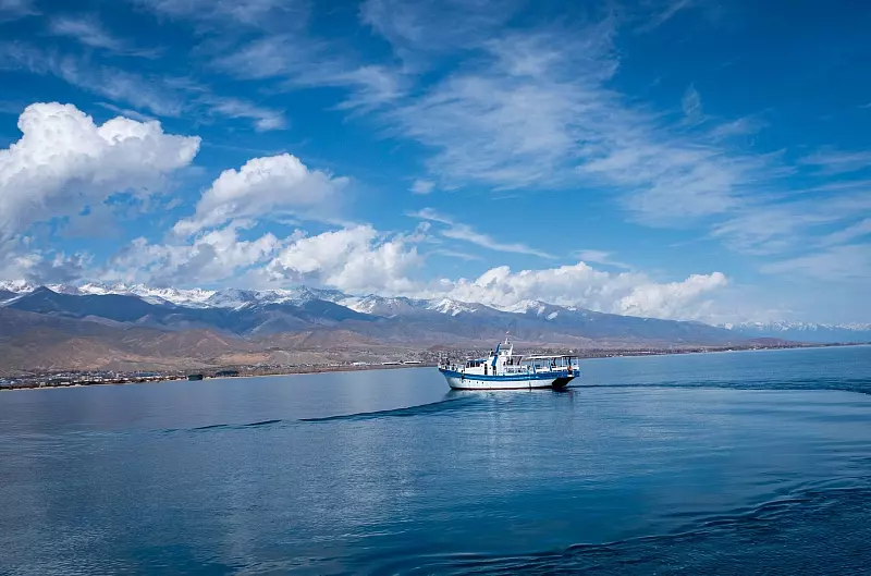 «Die Perle Kirgistans», wie es heißt, ist der Yssyk-Köl, der zweitgrößte Gebirgssee der Welt, nach dem Titicacasee in Südamerika. Bei einer Bootstour saugen wir die frische Luft ein, die Blicke auf Vier- und Fünftausender. Zerfaserte Wolken nehmen Spiegelbäder im Dunkelblau des Wassers. Die Varianten der Seidenstraße liefen am Nord- und Südufer entlang.