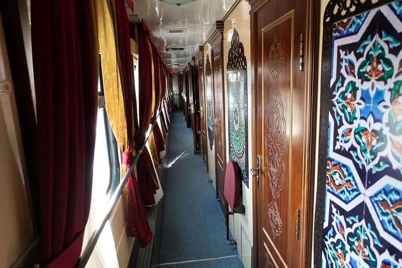 Das Abenteuer beginnt, als der Zug am Abend Taschkent verlässt. Der Abschied am Nordbahnhof fällt leicht. Die Millionenstadt erscheint als Mittelmaß: moderne Moscheen, viele Baustellen, Staus. Es dröhnt. Es klackt. Es rattert. Das ist der Klang, mit dem der Sonderzug auf den Trip einstimmt.