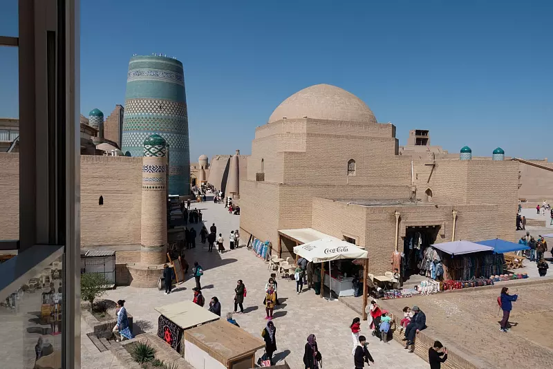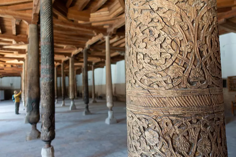 Der Zug rollt in die untergehende Sonne, am Morgen sind wir in Chiwa. Der historische Kern schnürt sich in Stadtmauern, lockt als oft propagiertes «Märchen aus 1001 Nacht» – und kostet Eintritt. Was in Europa heiß diskutiert würde, ist hier ein eiskaltes Geschäft. Für umgerechnet 18 Euro darf man durch die Gassen streifen und wichtige Monumente besuchen: den Palast Kunya Ark, das Haremshaus, die Dschuma-Moschee mit ihrem Holzsäulenwald.