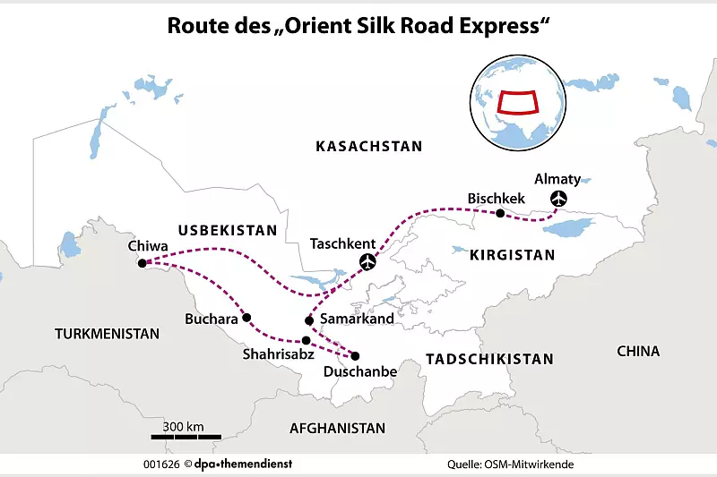 Während China zwischen Xinjiang und dem Arabischen Meer derzeit an einer «Neuen Seidenstraße» baut, hat das Original heute vor allem touristisches Potenzial. Den historischen Wegen und Stationen in Zentralasien folgt ein gecharterter Sonderzug, der «Orient Silk Road Express». Knapp 14 Tage dauert die Reise auf Schienen durch die «-stan»-Länder Usbekistan, Tadschikistan, Kirgistan, Kasachstan.