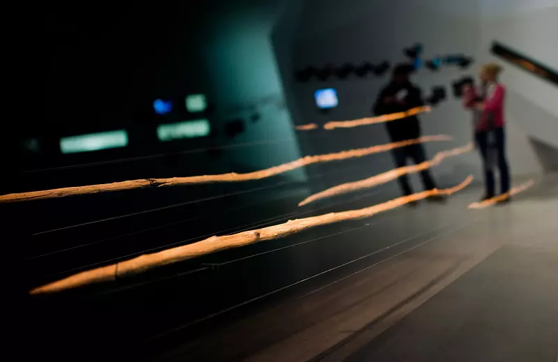 Allerdings birgt das Museum weit mehr als verwittertes Holz. Der aufwendig gestaltete Lehrpfad durch die Altsteinzeit beginnt im Foyer mit effektvoll inszenierten Bodenprofilen. Aussparungen an den Außenwänden geben derweil den Blick auf den nahen Tagebau frei.