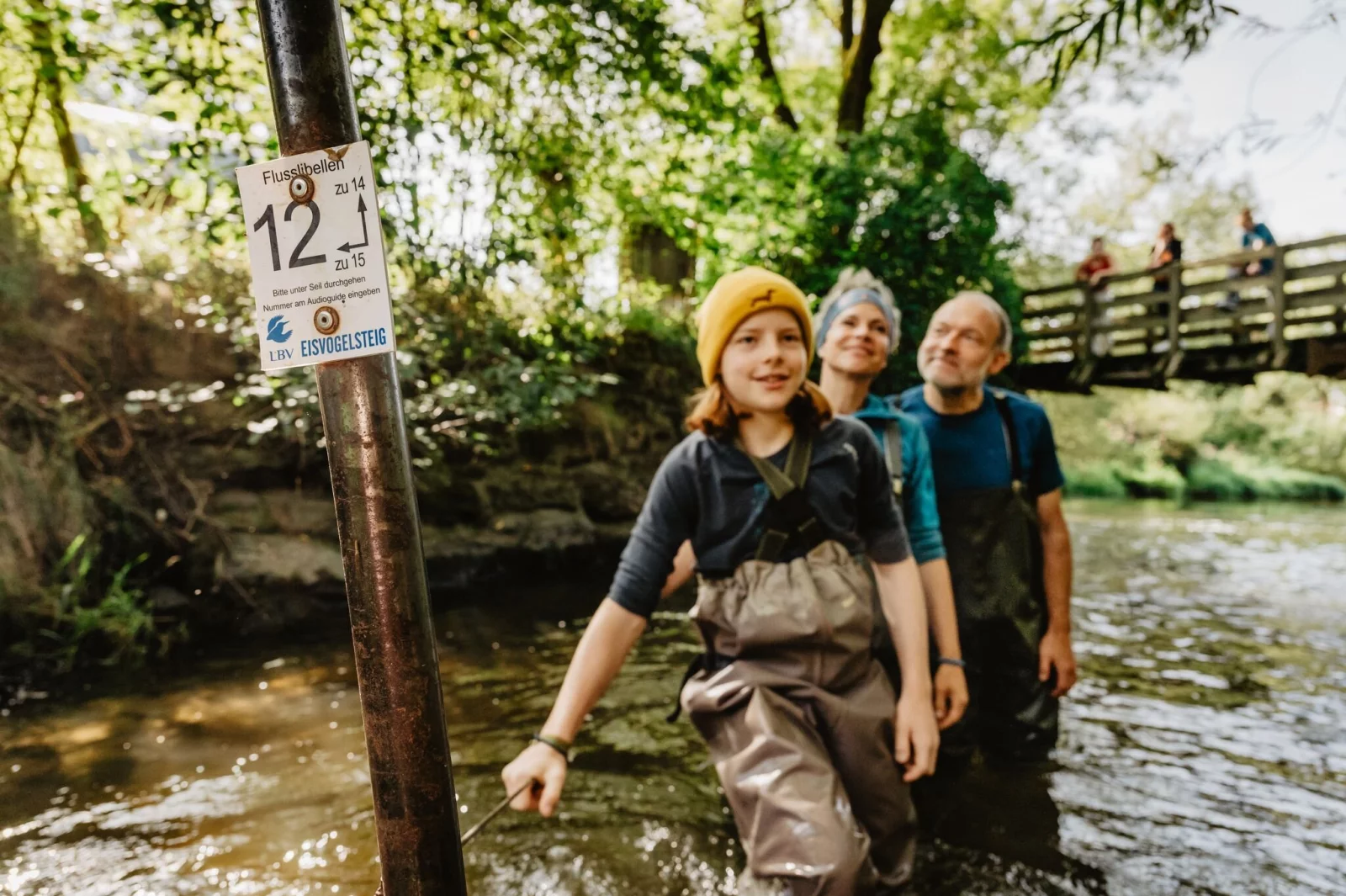 Ausgerüstet mit Wathose, Audioguide und Klettergurt steigen wir die Steinstufen zum Fluss hinunter. Der Chamb schlängelt sich durchs Gelände. Stahlseile sind durch den Fluss gespannt, der aus Tschechien kommt und später in den Regen mündet. Sie markieren hier, in der Oberpfalz, den Eisvogelsteig.