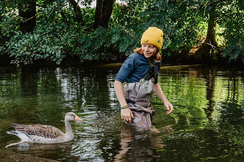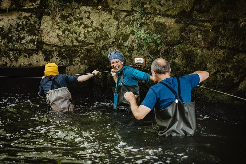 Jetzt führt das Seil auf den Auslauf des Wasserrades zu, das sich am LBV-Zentrum dreht und der Stromgewinnung dient. Mit der Strömung steigt der Abenteuerfaktor. Der Druck des Wassers presst Gummistiefel und Wathose eng an den Körper, am Seil kann man sich zum Glück gut führen. Kalt wird es aber – trotz 25 Grad Lufttemperatur. Gut festhalten, Füße mit Bedacht aufsetzen und durch den Auslauf – auch diese Etappe geschafft.