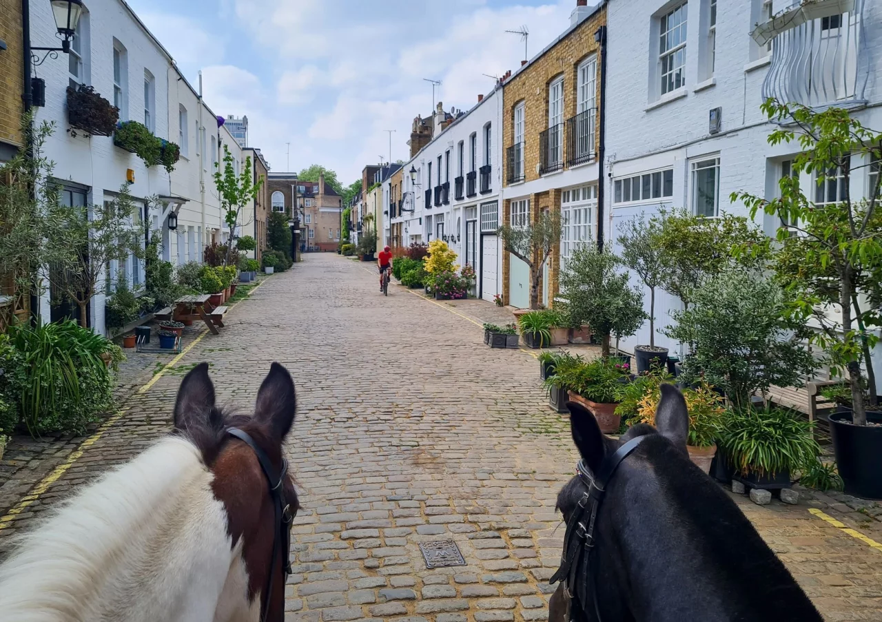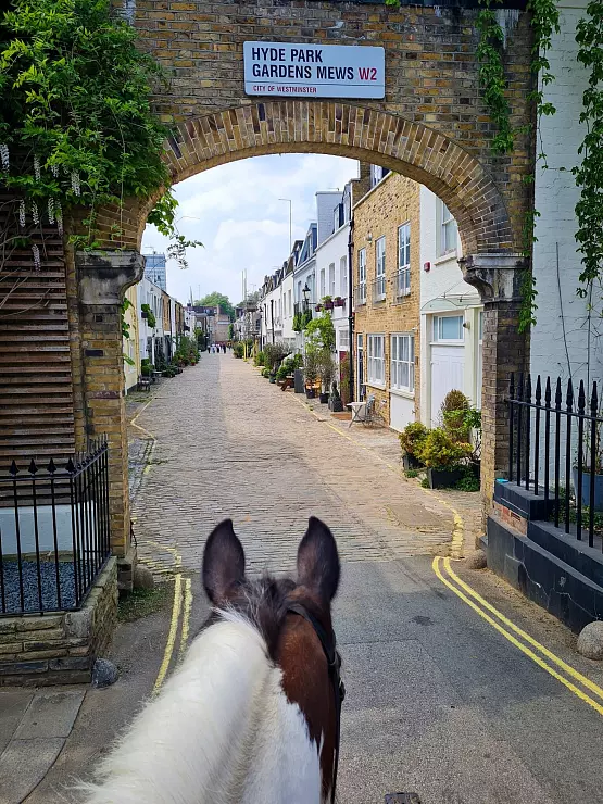Am Stall in der Gasse Bathurst Mews angelangt, wimmelt es vor Ponys und Pferden. Ein surreal dörflich anmutendes Miteinander inmitten der 9-Millionen-Stadt. Die nächsten Reiter satteln auf; ein Tross des benachbarten Stalls Ross Nye Stables zuckelt durchs Tor, der in London seine Geschäfte mittlerweile dichtgemacht hat. Mitarbeitende versorgen und pflegen die Tiere – oder schaufeln Pferdeäpfel vom Kopfsteinpflaster der charmanten Gasse, die mit ihren cremefarbenen niedrigen Häusern ihrerseits ein Hingucker ist.