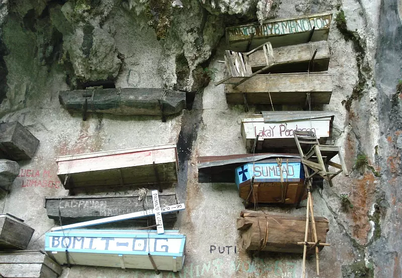 Kurios um den Bergort Sagada, auf 1.600 Metern Höhe im Norden der Hauptinsel Luzon gelegen, sind bekannte historische Begräbnisstätten. In der Höhle Lumiang stapeln sich zahlreiche Steinsärge übereinander. Noch schauriger wirken die Felswandbestattungen in hängenden Särgen. Das Verfahren schützte einst vor Grabräubern und wilden Tieren.