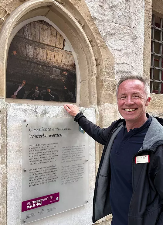 Fotostopp vor dem Steinernen Haus: Stephan Oettel ist Gästeführer und Koordinator im Netzwerk «Jüdisches Leben Erfurt». (© Heide Scharvogel/dpa-tmn)