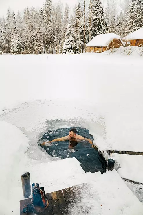 Dann ist es Zeit für die erste Abkühlung. Raus aus der Sauna und mit einem spitzen Schrei hinein in den See, abreiben mit Schnee. Herrlich! Im Nebenraum brennt ein Kamin, es gibt Decken zum Einkuscheln, mit Honig gesüßten Tee und Cranberrys.