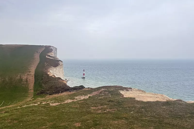 Und dann sind da doch noch ein paar herangekarrte Touristen. Denn hinter der siebten Schwester befindet sich am Birling Gap ein Parkplatz, samt Café und Shop. Letztere sind sogar ganz nett. Von hier aus ist es nur noch ein kurzer Weg zum Beachy Head. Dieser Felsen gehört nicht zu den sieben Schwestern, die wie die Orgelpfeifen aufgereiht hintereinanderstehen - aber er ist mit 162 Metern der höchste Kreidefelsen Großbritanniens, und einen klassisch rot-weißen Leuchtturm gibt es auch.