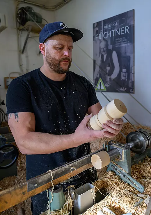Das Geburtshaus des erzgebirgischen Nussknackers liegt unscheinbar am Ortsrand des Spielzeugdorfs Seiffen. In der achten Generation führt Markus Füchtner den kleinen Betrieb, dessen Geschichte bis ins 18. Jahrhundert reicht. Wie schon seine Vorfahren steht der 44-Jährige an der Drechselbank und bearbeitet ein sich drehendes Kantholz mit verschiedenen Werkzeugen. Die Späne fliegen, ein neuer Nussknacker wird geboren.