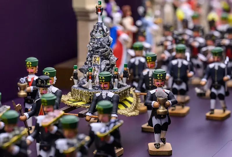 Im festlichen Habit ziehen Miniaturfiguren in der «Manufaktur der Träume» in Annaberg-Buchholz zur großen Bergparade von 1719 auf. - © Hendrik Schmidt/dpa