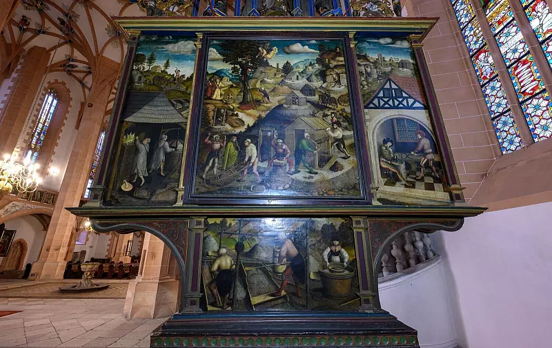 Blick auf den berühmten Bergaltar der St. Annenkirche in Annaberg-Buchholz. Die Darstellungen bergmännischen Lebens vor 500 Jahren werden dem Maler Hans Hesse zugeschrieben. - © Hendrik Schmidt/dpa