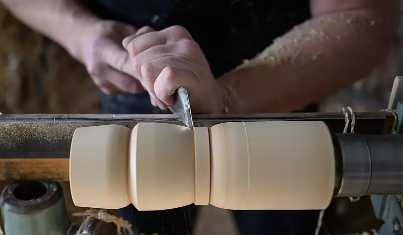 In der Werkstatt von Holzspielzeugmacher Markus Füchtner wird der Körper eines Nussknackers gedrechselt. - © Hendrik Schmidt/dpa