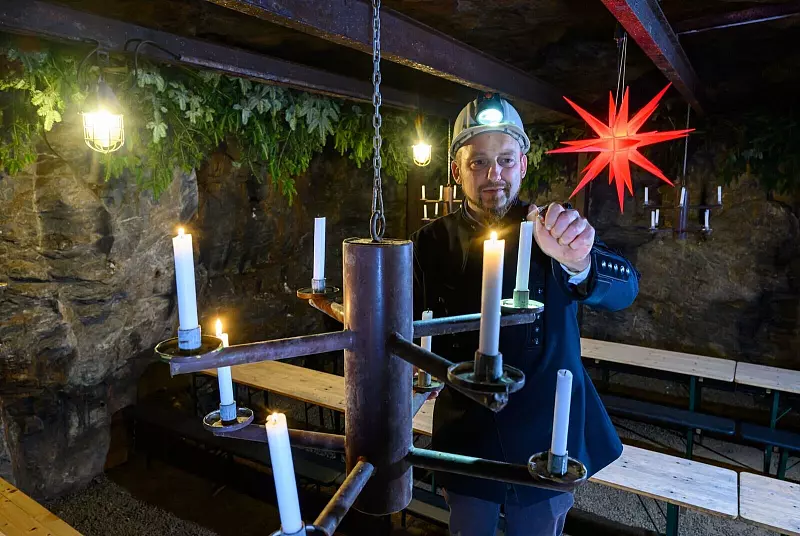 Von der Maschine selbst ist nichts mehr zu sehen, dafür hat sein Verein den Raum mit Kerzenleuchtern, Reisig und einem Weihnachtsbaum geschmückt. Denn hier unten im Besucherbergwerk halten sie einen alten bergmännischen Brauch wach: die Mettenschicht.