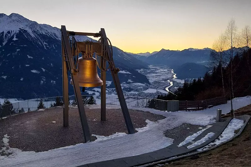 Ich aber mache den Klassiker - ohne Gepäcktransport, keine Wiederkehr. Im Dorf Mösern, Ort meiner nächsten Unterkunft, läutet gerade die Friedensglocke, die dort als Denkmal errichtet wurde. Welch beruhigender Klang vor imposanter Alpenkulisse bei Sonnenuntergang!
