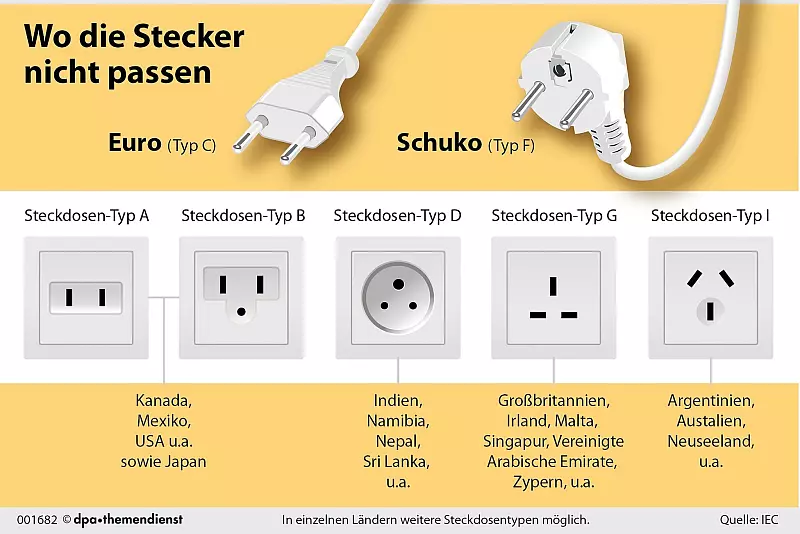 Wobei es immer auch Abweichungen geben kann: So ist zum Beispiel in Argentinien zwar der aus drei Schlitzen bestehende Dosentyp I - das «besorgte Gesicht», das auch in Australien gängig ist - weit verbreitet. Gerade im Norden des südamerikanischen Landes kann einem aber etwa auch Typ C begegnen, also eine Dose, wo der heimische Eurostecker passen würde.