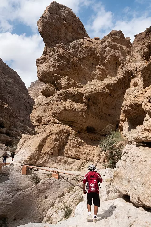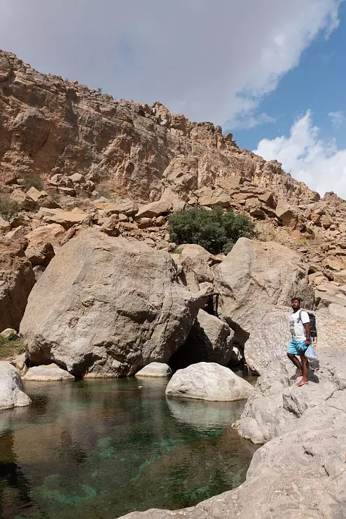 Wer tiefer ins Wadi Hawer eintauchen will, vertraut sich dem lokalen Führer Hweather Hamud (26) an. Ohne dessen Ortskenntnis findet man den Anschlusspfad im breiten Tal nicht. Es geht über Geröllmassen und durchlöcherte Felsen. An einer kritischen Stelle hangelt man sich über Sprossen an einer Metallkette aufwärts. Hamud ist barfuß auf Achse. «So habe ich mehr Halt. Mit Schuhen ist mir das zu glitschig», sagt er. Lohn der Kletterpartien sind smaragdgrüne Badebassins und ein Wasserfall, der sich vor den majestätischen Bergflanken abhebt. Ein entlegenes Naturparadies.