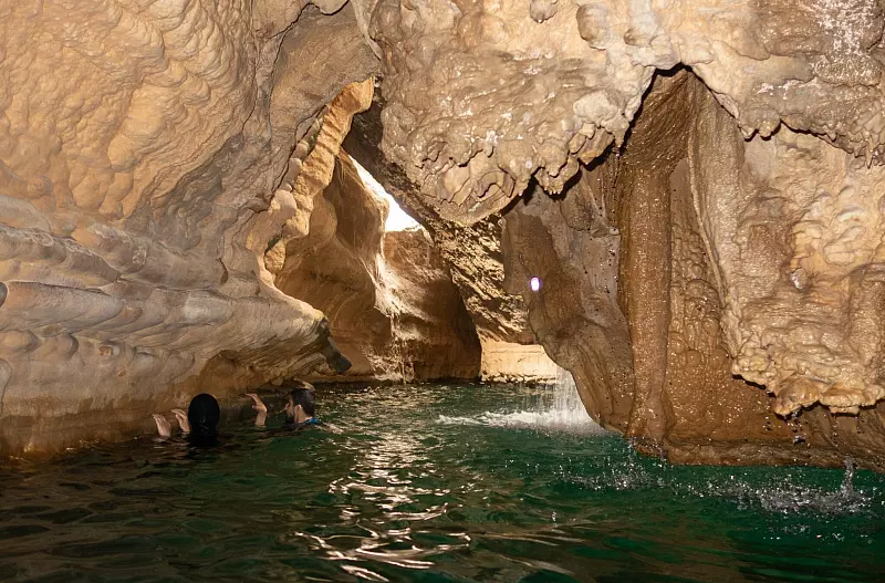 Höhle und Kaskade gehören zum Wadi Shab, einem leicht zugänglichen Trockental. Der Einstieg liegt eineinhalb Fahrstunden südöstlich der Hauptstadt Maskat hinter der Küste. Auf eine kurze Bootsfahrt folgt der Fußweg durch den Canyon, gesäumt von Überhängen und senkrechten Felswänden. Verlaufen kann man sich nicht.