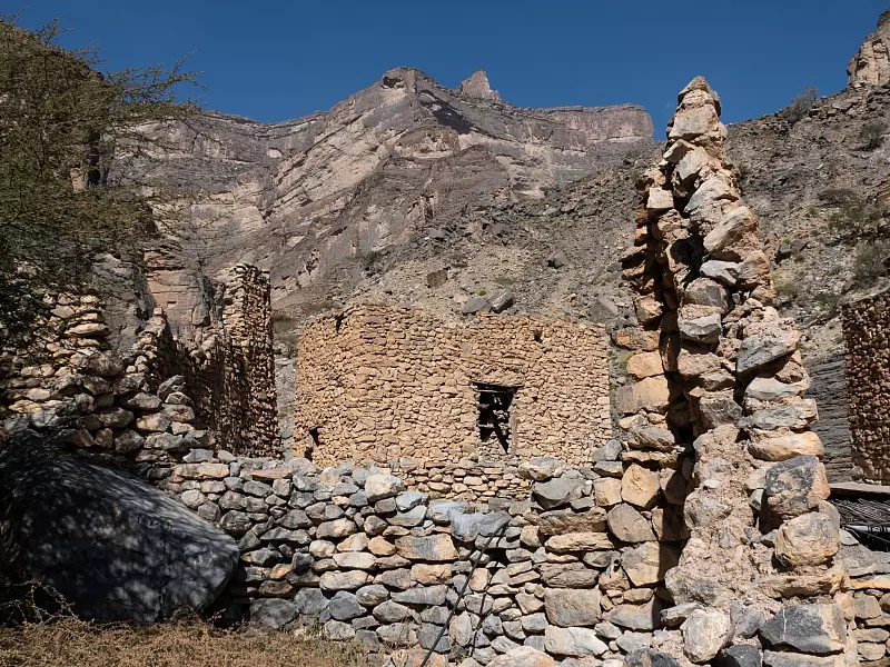 Durch das Wadi Tiwi, den Nachbarn von Shab, zieht sich ein enges, steiles Sträßchen. Das Grün des Talgrunds und die Wildwest-Szenerie darüber sind wie mit einem Messerschnitt voneinander getrennt. Auf den Parzellen wachsen Mangos, Bananen, Palmen. Doch die Traditionen verblassen. Die Jüngeren wandern lieber in die Städte ab.