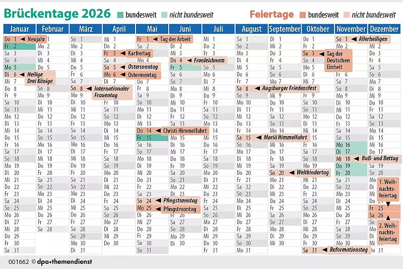 Einige der beweglichen Feiertage kommen 2026 nicht wirklich zur Geltung: Der Tag der Deutschen Einheit (3. Oktober) und der 2. Weihnachtstag (26. Dezember) liegen jeweils auf einem Samstag.