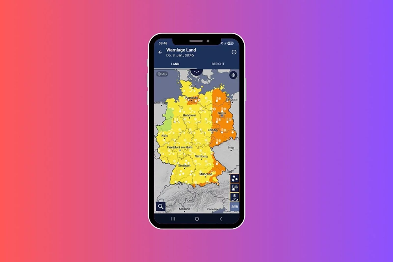 Violett ist die höchste Warnstufe und steht für extremes Unwetter, großräumige Beeinträchtigungen und Lebensgefahr, etwa bei extremem Schneefall oder gefährlichem Glatteis. Der DWD empfiehlt dann dringend, das Haus nicht zu verlassen und behördliche Hinweise zu beachten.