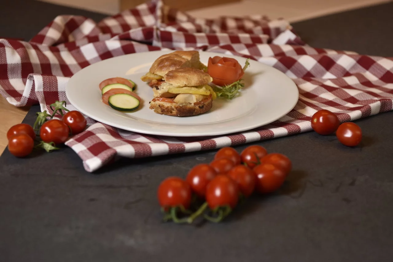 4. Den Käse darüberstreuen und für ca. 15 Minuten im Backofen bei 180° backen. Anschließend das Oberteil der Strohsemmel auflegen und nochmals 5 Minuten mitbacken.