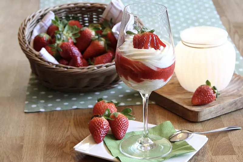 Creme, Erdbeermus und Erdbeerstücke abwechselnd in sechs Dessertgläser schichten. Mit ganzen Erdbeeren verzieren.