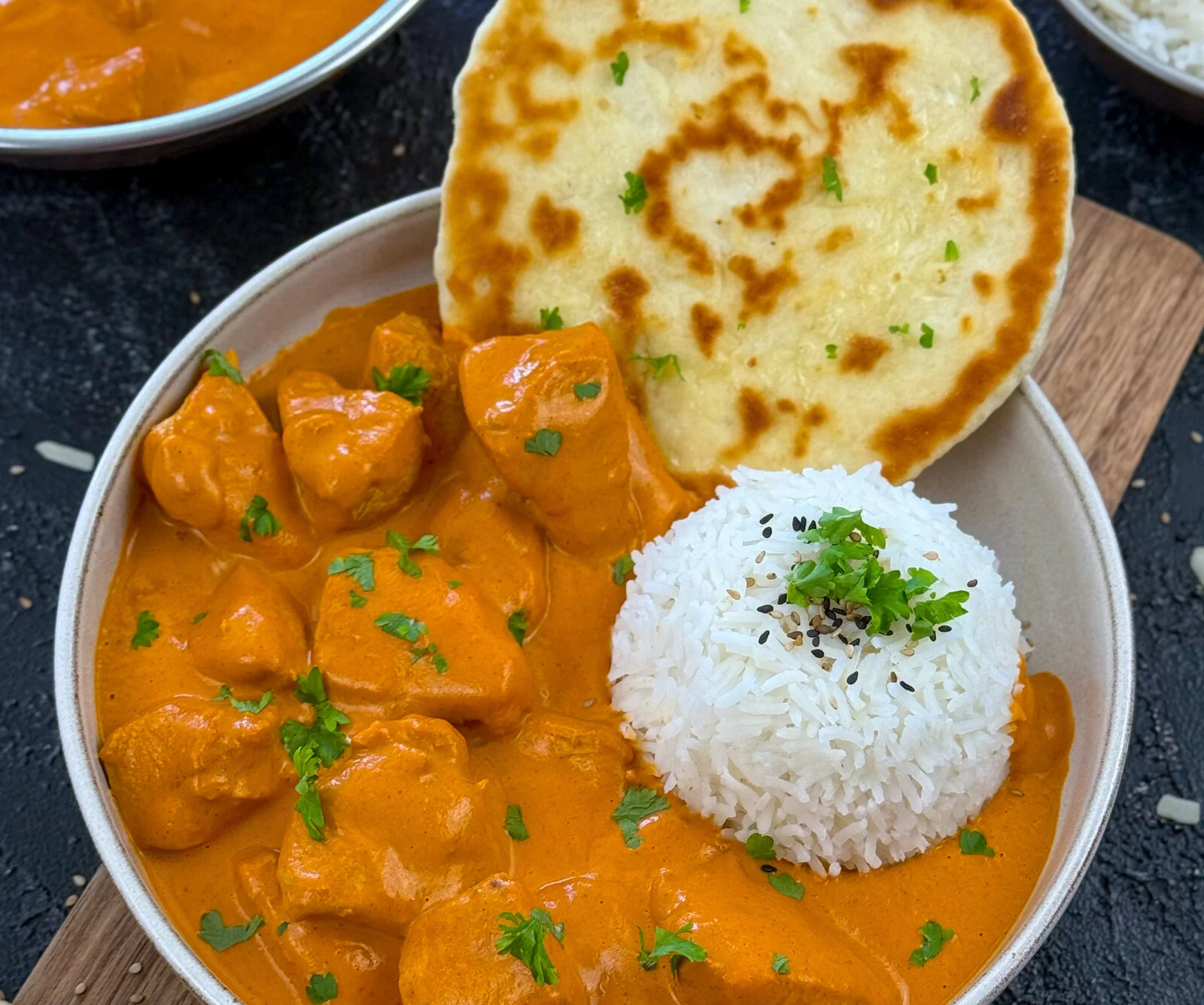 - Und schon kannst du das Butter-Chicken mit dem Basmati-Reis oder Naan Brot servieren.