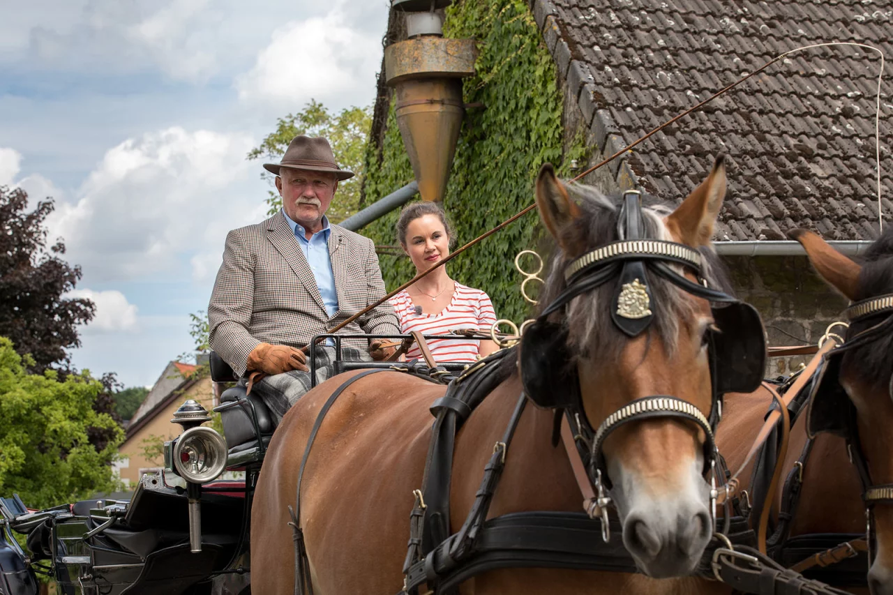Wenn Heinrich Meyer zu Hücker aus Diestelbruch auf dem Bock einer Kutsche sitzt und zwei Pferde für Vortrieb sorgen, ist er voll in seinem Element und einfach glücklich. Die Fahrerdecke auf dem Schoß, die Zügel und Peitsche locker in den behandschuhten Händen, geht der Blick des bundesweit bekannten Züchters auf die herrliche Landschaft rundum.